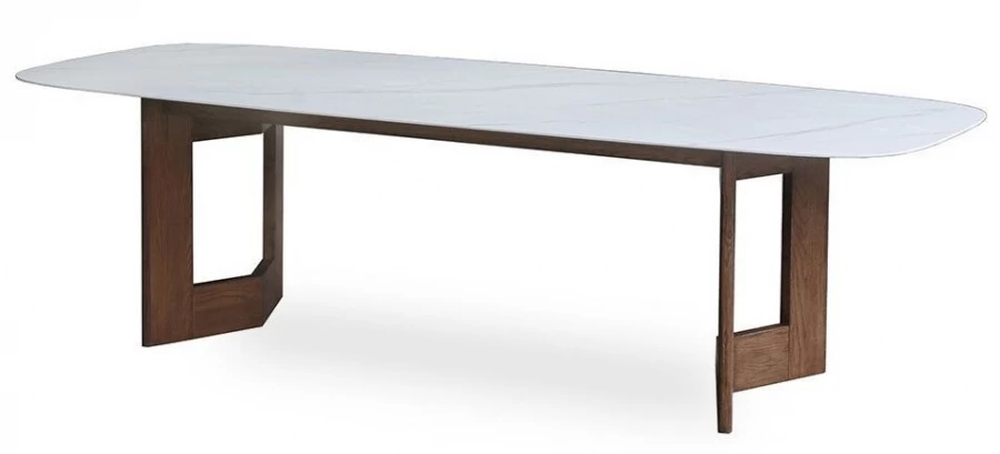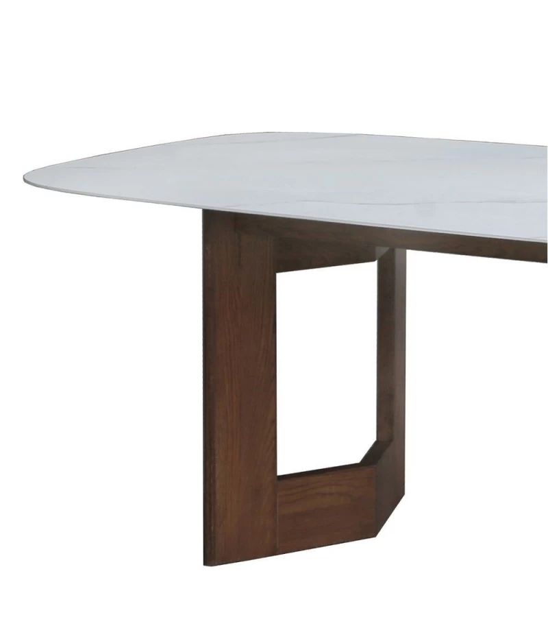 Cette table à manger est réalisée avec un piètement contemporain en chêne couleur brun et habillé d’un grand plateau en pierre composite blanche.