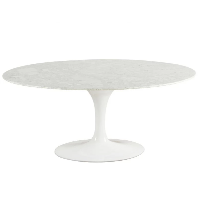Très chic table ovale da la collection Marbella. Pied central tulipe en métal blanc brillant habillé d’un plateau en marbre blanc.