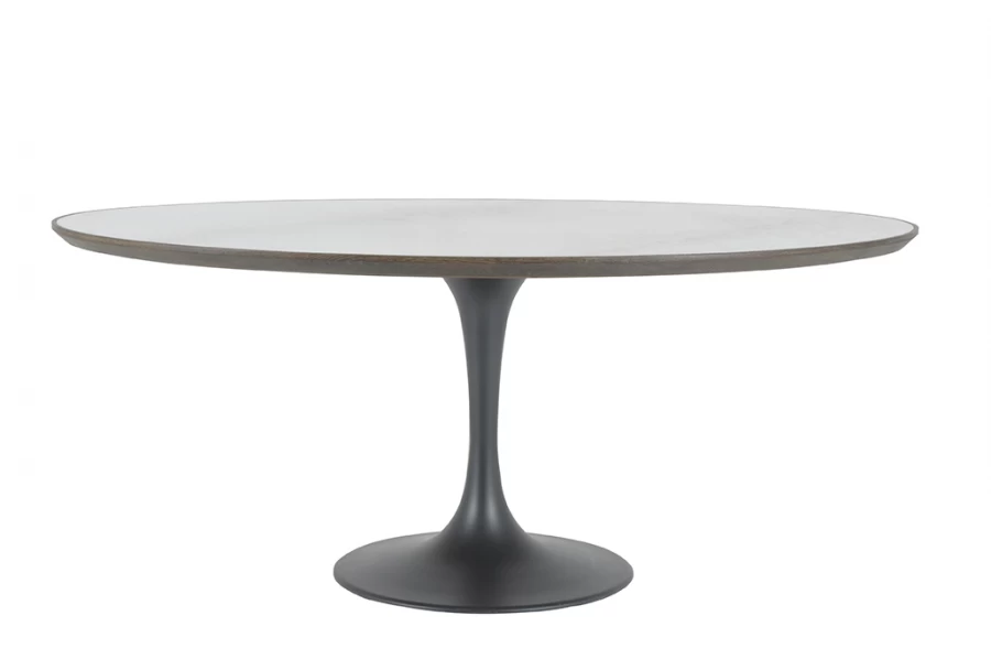 La table à manger très tendance de forme ovale contemporaine avec empiètement central en métal noir mat habillé d’un plateau ovale en marbre blanc. Le plateau est doté d’une finition en chêne sur sa circonférence.