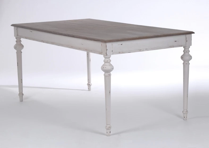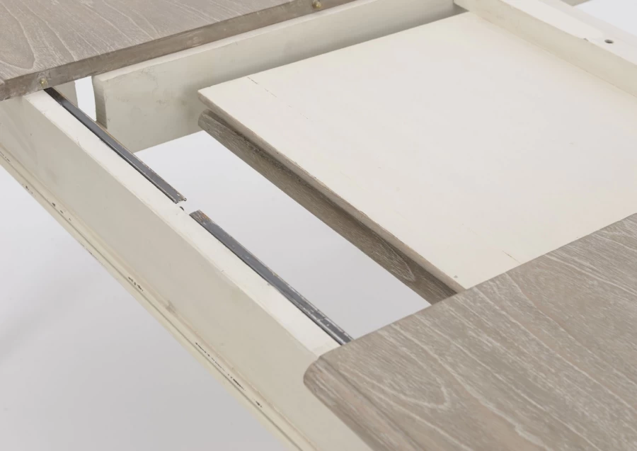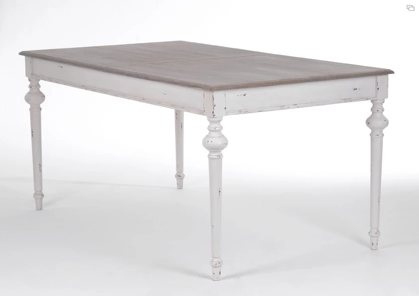 Belle table à manger rectangulaire entièrement réalisée en bois 2 tons. Empiètement ivoire et plateau naturel grisé. Cette table est extensible avec 1 rallonge intégrée.
