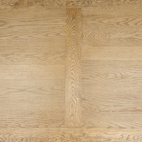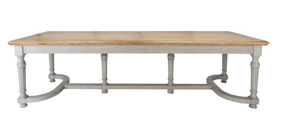 Grande table rectangulaire pour les repas extrèmement bien travaillée dans un esprit charme. Empiètement réalisé en peuplier patiné gris vieilli et habillé d’un plateau en chêne massif style parquet.