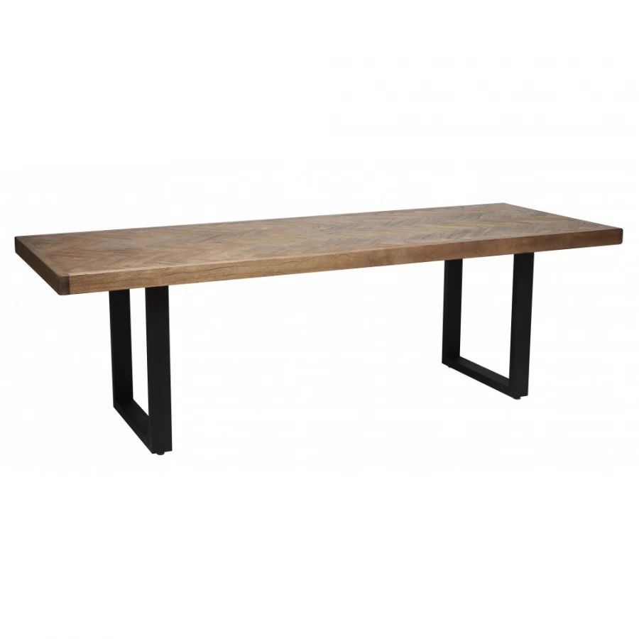 Belle table à manger rectangulaire style Indus ou campagne contemporain chic réalisée sur un piètement métal U noir habillé d’un plateau chevron en teck.