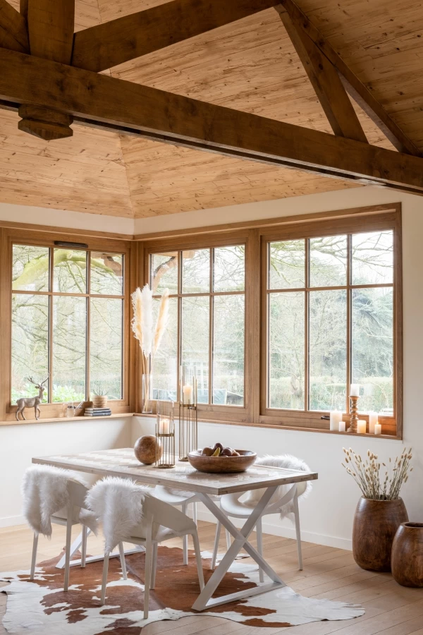 Table à Manger rectangulaire de la collection Zig Zag, réalisée avec un piètement métal habillé d’un plateau en bois. Les dessins du faconnage bois sur le plateau donnent le nom Zig Zag à la collection.