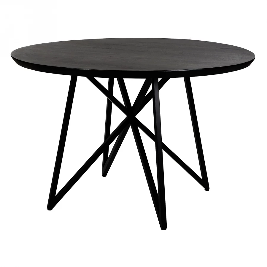 Très belle table ronde à manger réalisée avec piètement croisé en métal noir habillée d’un magnifique plateau en bois d’acacia noir de très belle qualité