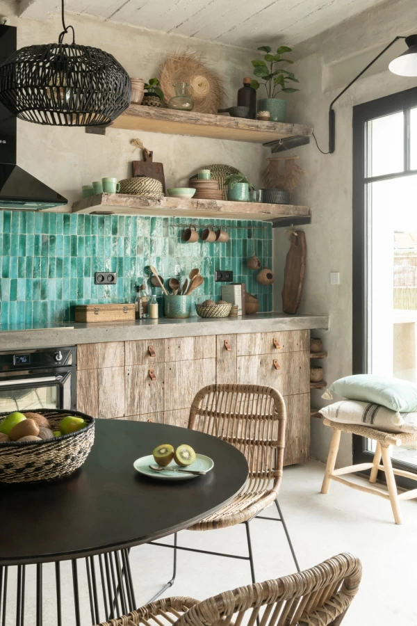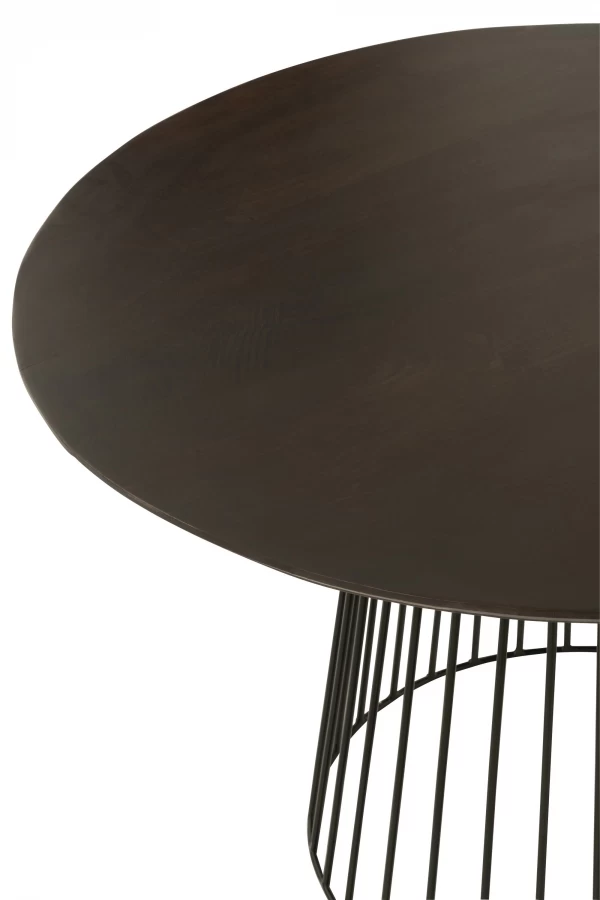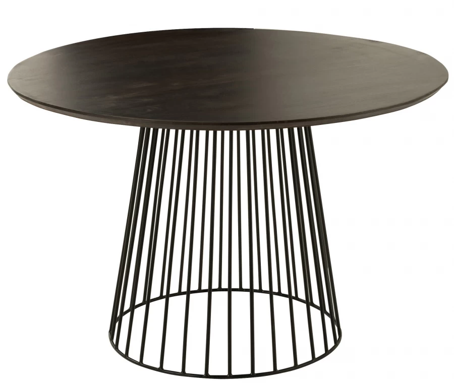 Toute nouvelle table à manger ronde de style contemporain réalisée avec un piètement central filaire en métal noir habillé d’un plateau rond en bois de couleur marron foncé.