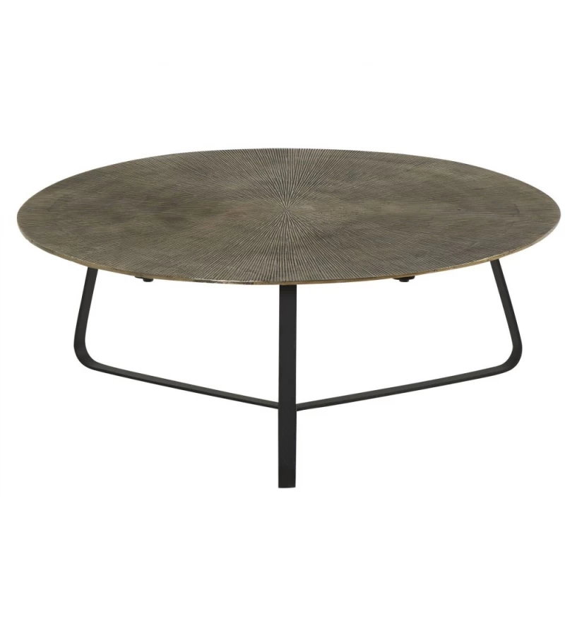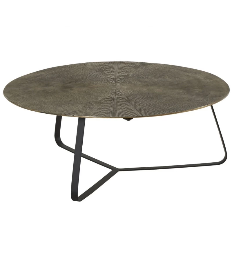 Piètement métal gris anthracite habillé d’un plateau rond en aluminium strié doré.