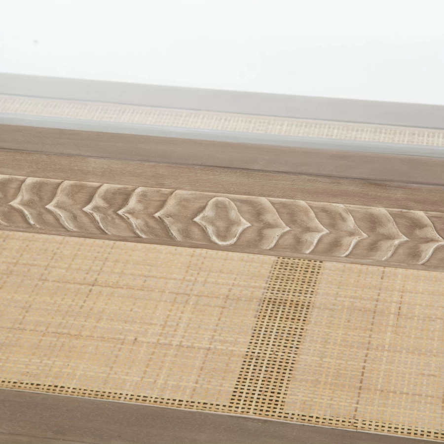 Ce modèle est réalisé avec un piètement en bois, une étagère en rotin naturel tressé et un plateau en verre.