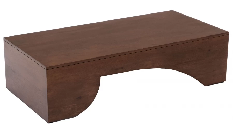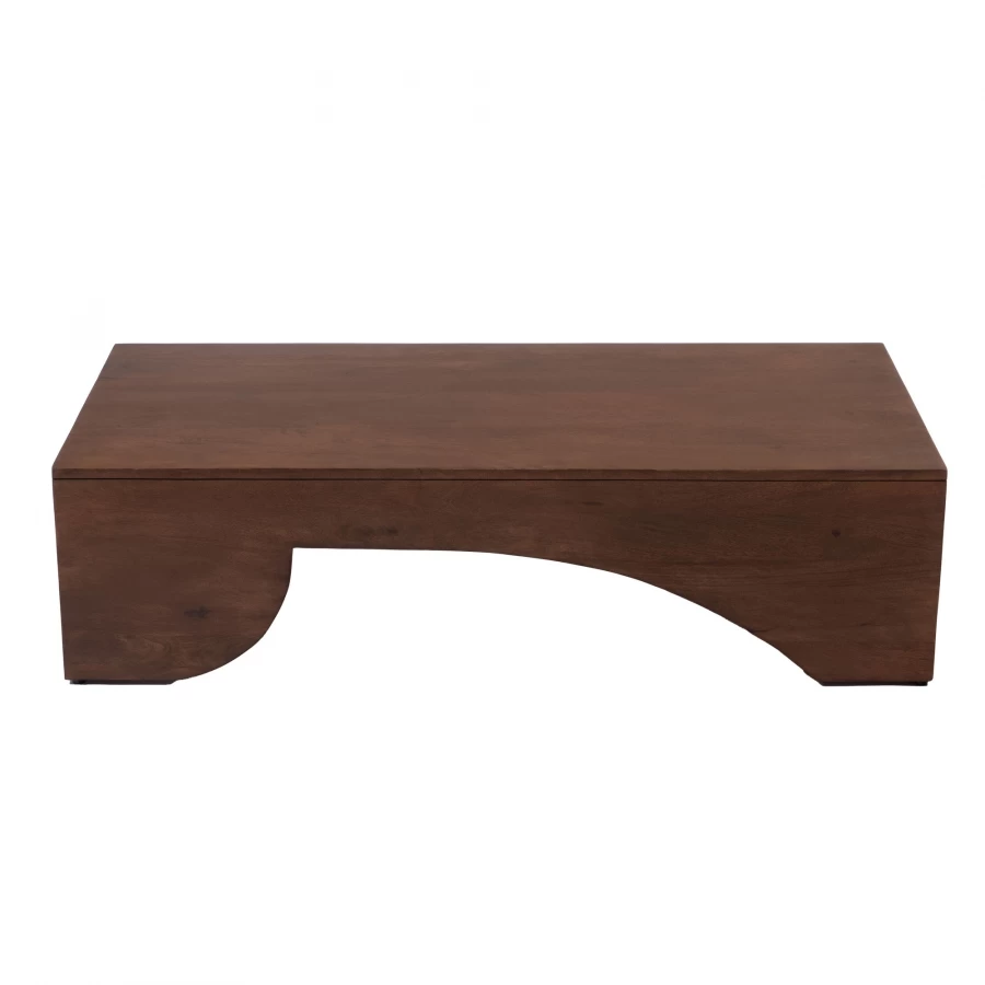 Cette table basse rectangulaire de salon très originale est entièrement réalisée en bois de manguier teinté foncé. Son piètement 2 pieds très contemporain sera très remarquée par vos convives. La table est est très stable.
