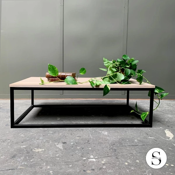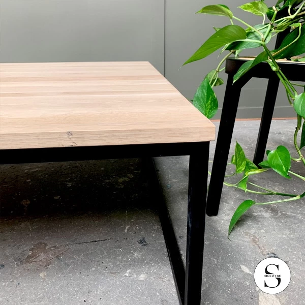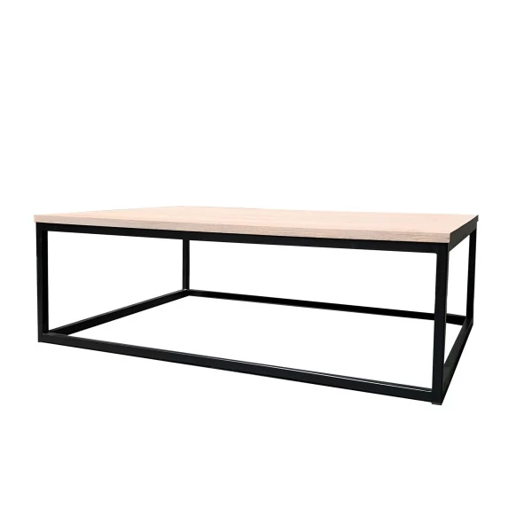 Cette table basse est réalisée avec un piètement en métal noir et est habillée d’un plateau en chêne massif naturel.