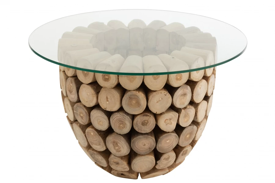 Cette petite table d’appoint ronde faite d’un empillement de rondins naturel et habillée d’un plateau rond en verre trempé.