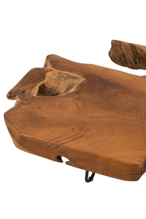 Empiètement métal noir habillé d’un plateau en teck teinté foncé.