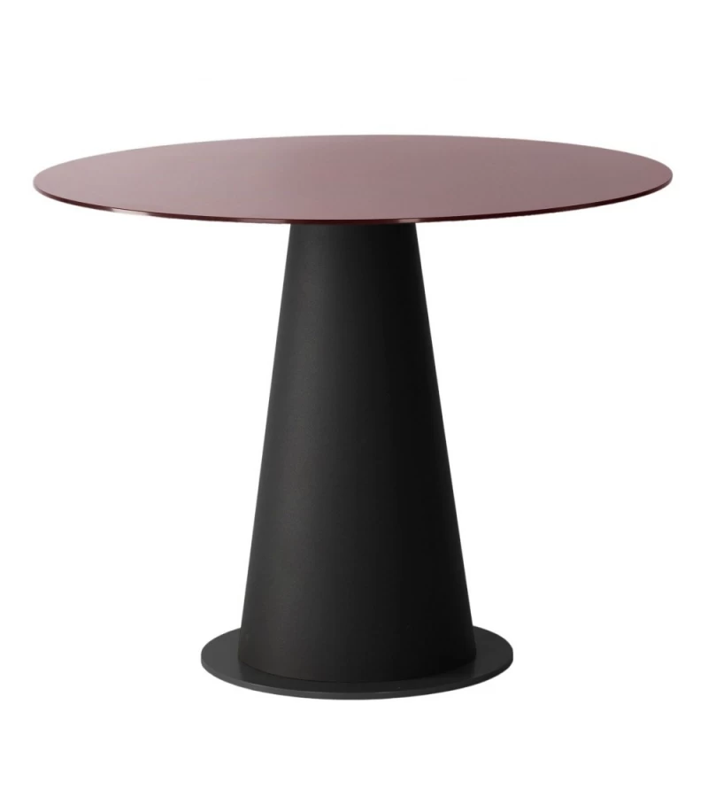 Nouvelle petite table contemporaine de la collection Impero réalisée avec un pied central conique en métal noir mat habllée d’un plateau rond en verre fin de couleur bordeaux.