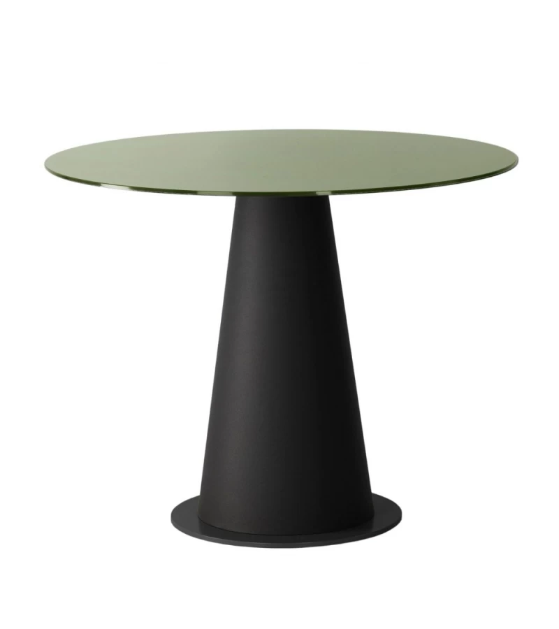 Nouvelle petite table contemporaine de la collection Impero réalisée avec un pied central conique en métal noir mat habllée d’un plateau rond en verre fin de couleur kaki.