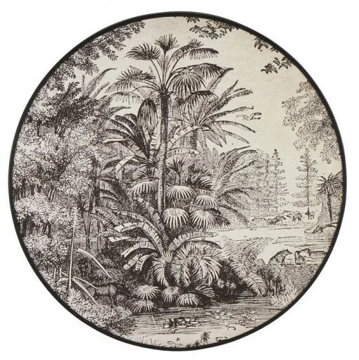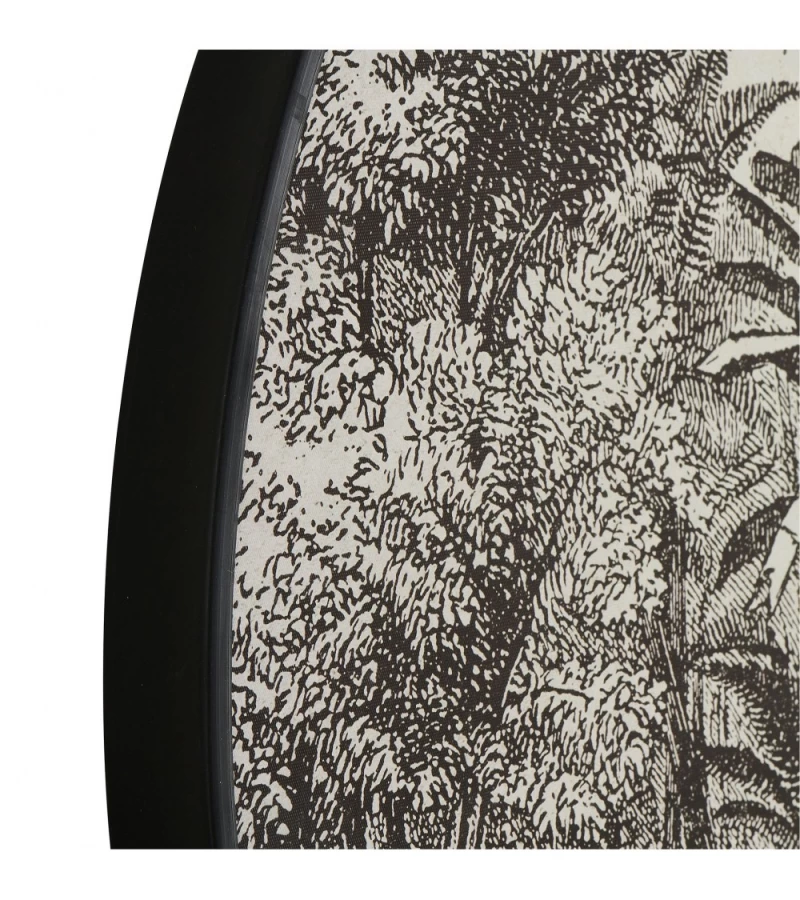 Très tendance ces déco murales rondes ! Voici un tableau de toile tendue ronde sur un thème végétale très actuel et exotique noir et blanc.
