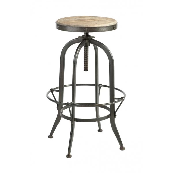 Tabouret de style industriel réalisé avec un piètement en métal vernis habillé d’un repose pied circulaire et d’une assise en pin massif naturel.