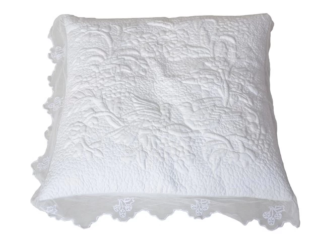 Très jolie taie d’oreiller en boutis brodé blanc proposée dans la collection Mariage de chez Coquecigrues.
