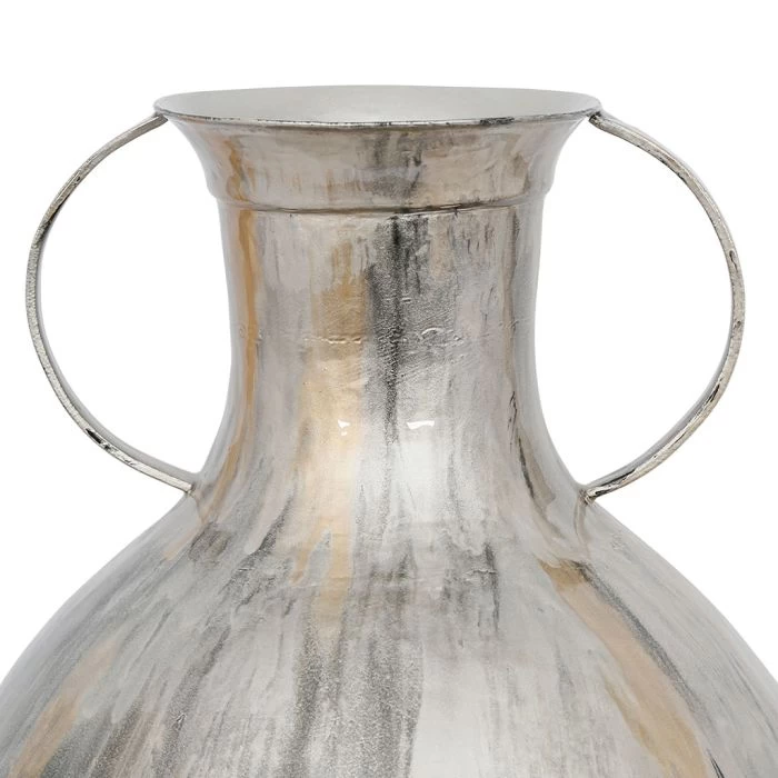 Réalisé en métal avec de belles proportions, ce vase est habillé d’une peinture brillante présentant beeaucoup d’effet de couleurs dans les tons beige, gris et doré. Ses 2 anses lui confèrent cette touche amphore.